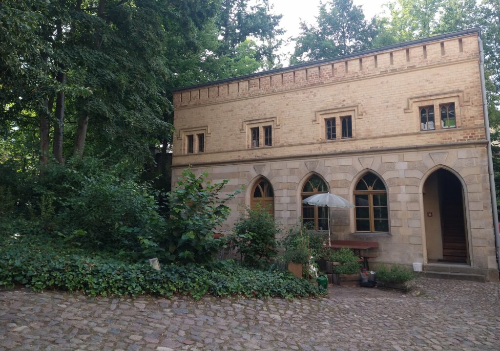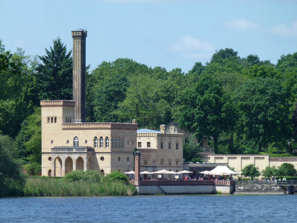 Die Meierei wurde übrigens noch unter Friedrich Wilhelm IV., König von Preußen erweitert, 1943/ 1844 wurde unter der Führung von Ludwig Ferdinand Hesse nach Plänen von Ludwig Persius ein zweites Vollgeschoß aufgesetzt. Ein Turm, der nicht einstürzt, kam hinzu sowie ein Zinnenkranz für den normannischen Charakter des Anwesens. Das war jedoch nicht alles. 1861 wurde die Meierei um ein Maschinenhaus, auch Pumpenhaus genannt, erweitert. Obendrein kam ein quadratischer Schornstein, ebenfalls mit Zinnen versehen, hinzu. Der ragt wie die Bäume darum herum rank und schlank in den Himmel über die Seen, der Jungfernsee zu Füßen, Heiliger See und Tiefer See nicht fern, hinauf, aber nicht bis zum Pfingstberg mit dem Panonatempel und samt dem beeindruckenden Belvedere mit super Aussicht von Kolonnade und Turm über das alte und neue Potsdam.