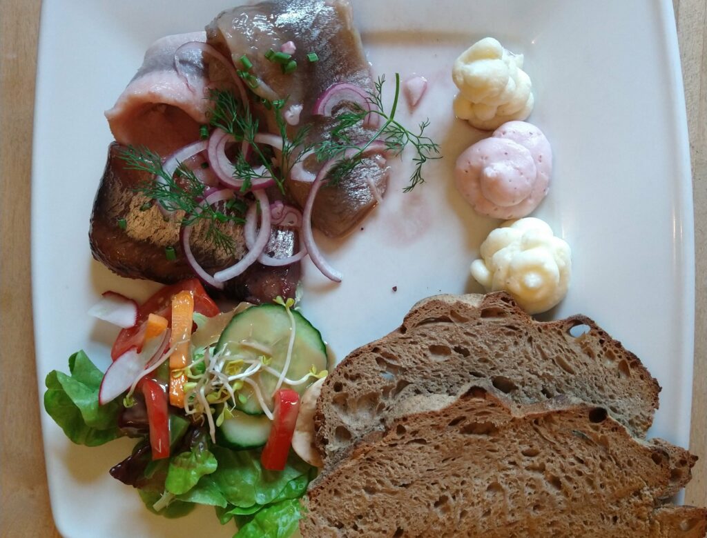Beim Schroten des Malzes oder Maischen im Sudhaus darf zugeschaut, aber nicht mitgeholfen werden. Das gilt auch für die gute Küche. Ein Einblick wird gerne gewährt, doch der Gast ist schließlich Gast. Er darf und soll genießen, beispielsweise Meierei-Brot mit Griebenschmalz und Spreewälder Gewürzgurke. Das muß sein und für mich auch der Matjes-Mix und die Soljanka und das Biergulasch vom Rind und das Eisbein „Berliner Art“ und so weiter und so fort.