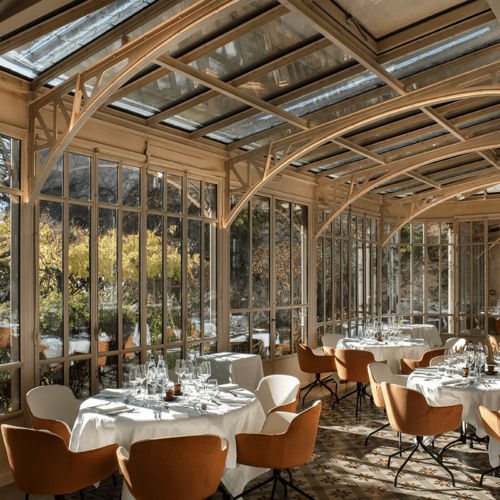 Das Gourmetrestaurant ist im Grunde genommen ein Glashaus aus dem 18. Jahrhundert nach unserer Zeitrechnung. Darum herum üppriges Grün und darin nachhaltige Gastronomie.