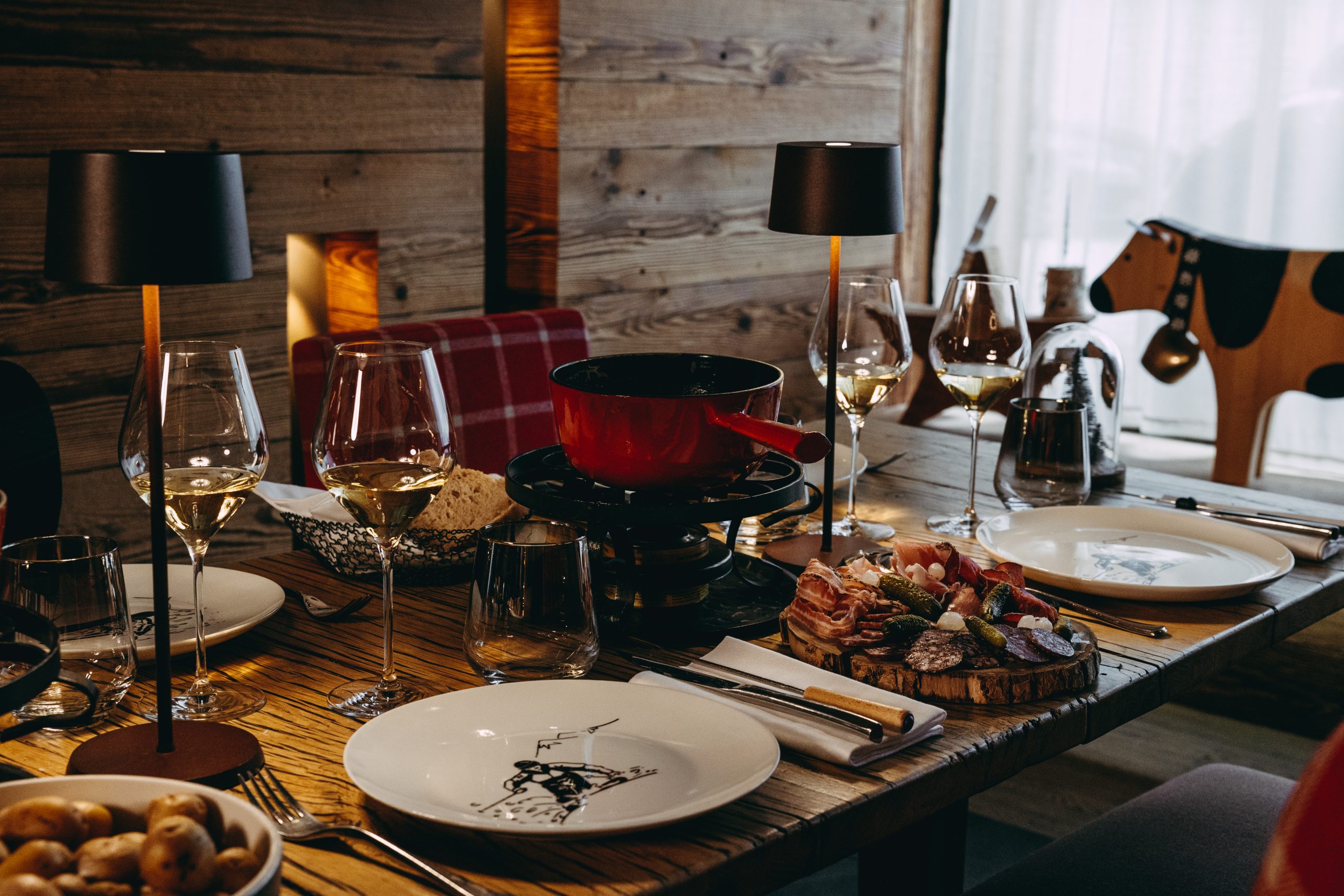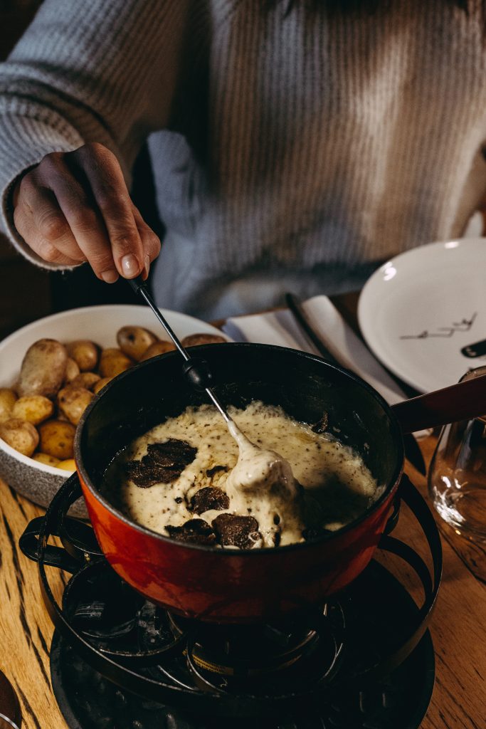 Auf der Karte stehen u.a. „Fondueau Gruyère,Vacherin et Raclette“ (traditionnelles, régionales Käasefondue), „Fondueà la truffenoire“ (Fondue mit Schwarzem Trüffel)“ und „Fondue au Champagne“ (Fondue mit Champagner), aber auch „Raclette valaisanne“ (Walliser Raclette). Vor- und Nachspeisen stehen auch auf der Speisekarte des Restaurants