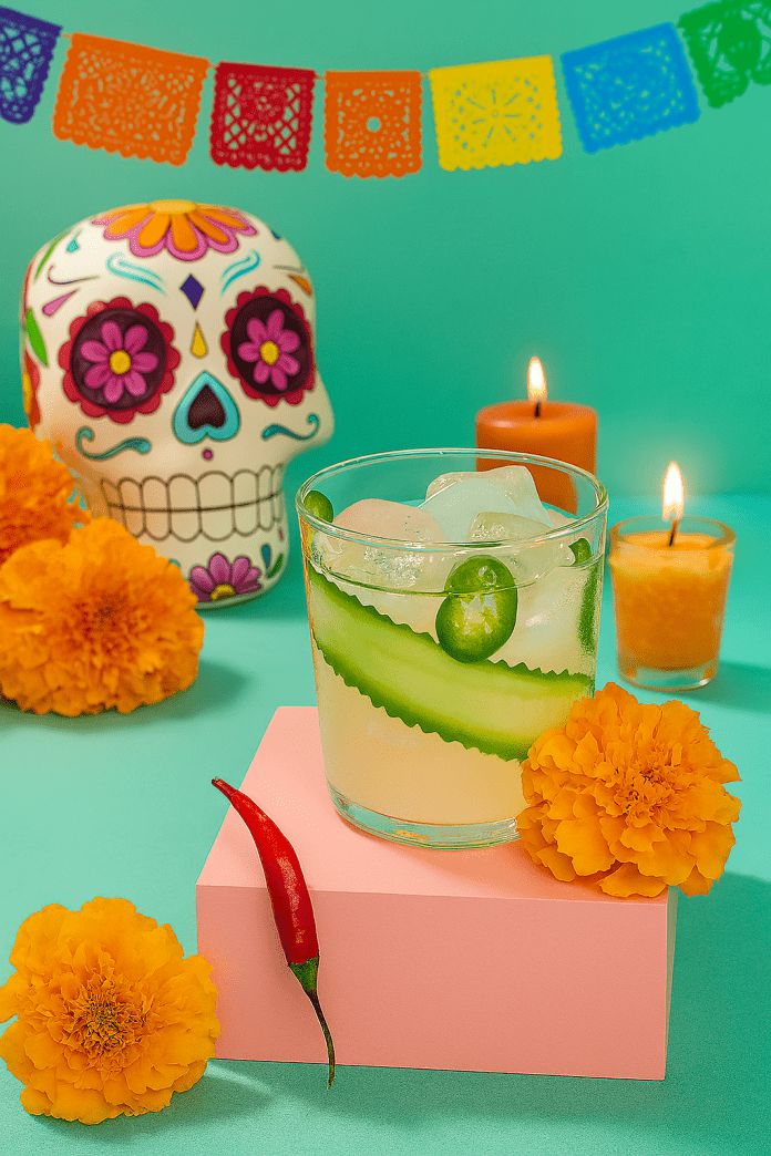 Berlin, Deutschland (Gastrosofie). Der Cucumber Jalapeño Margarita ist frisch, würzig und mit einem angenehmen Kick durch Cointreau für jede Día de los Muertos.
