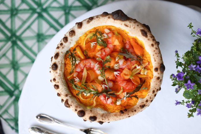 Die geschmorten Karotten und Carabineros hinzufügen, die Pizza für weitere 30 Sekunden in den Ofen geben. Mit den rohen violetten Karottenscheiben, Mikro-Koriander, Bio-Zitronenzeste und einem Schuss Zitronen-Olivenöl garnieren.