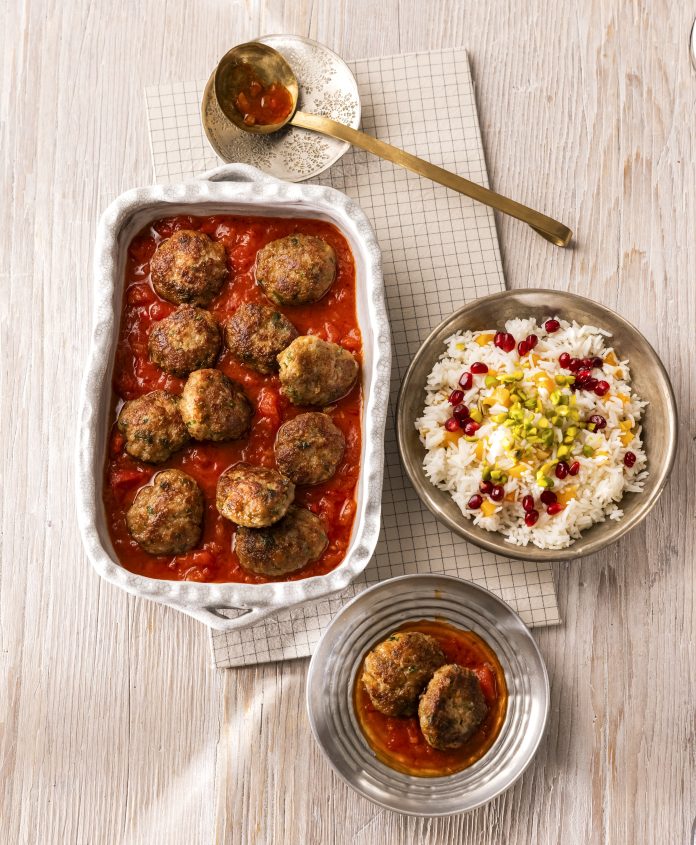 Mamas Köfte im Gewürztomaten-Sugo mit Pistazienreis und Granatapfelkernen