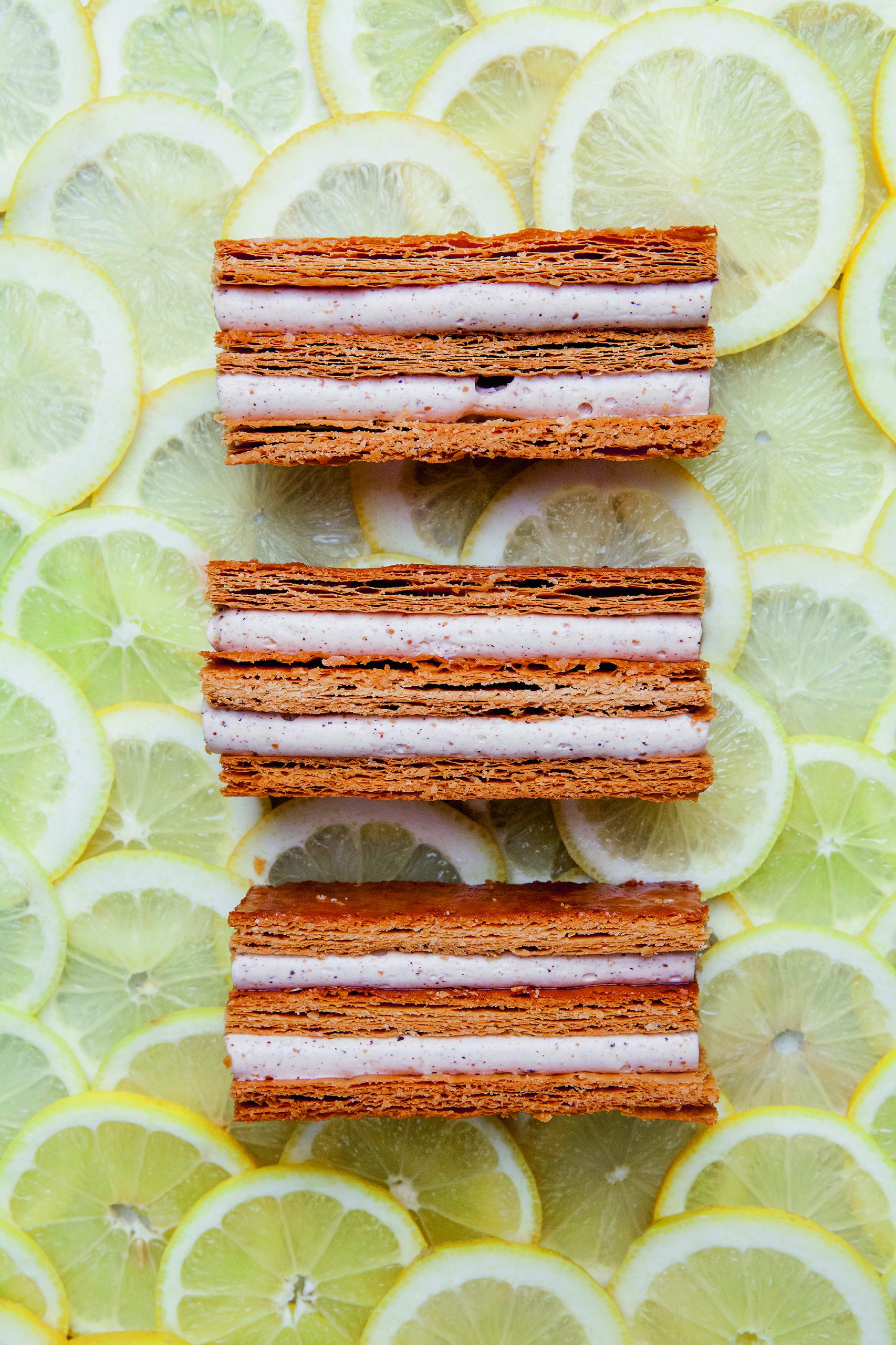 Den Umluftofen auf 180 °C vorheizen. Den Blätterteig mit dem Rollholz 2 mm dick ausrollen, dann zwischen zwei Blechen 30 Minuten backen. In 18 Rechtecke (10 × 4 cm) schneiden. Mit Puderzucker bestäuben und weitere 5 Minuten im Umluftofen backen. Dann 10 Minuten im normalen Backofen bei 250 °C karamellisieren lassen.
