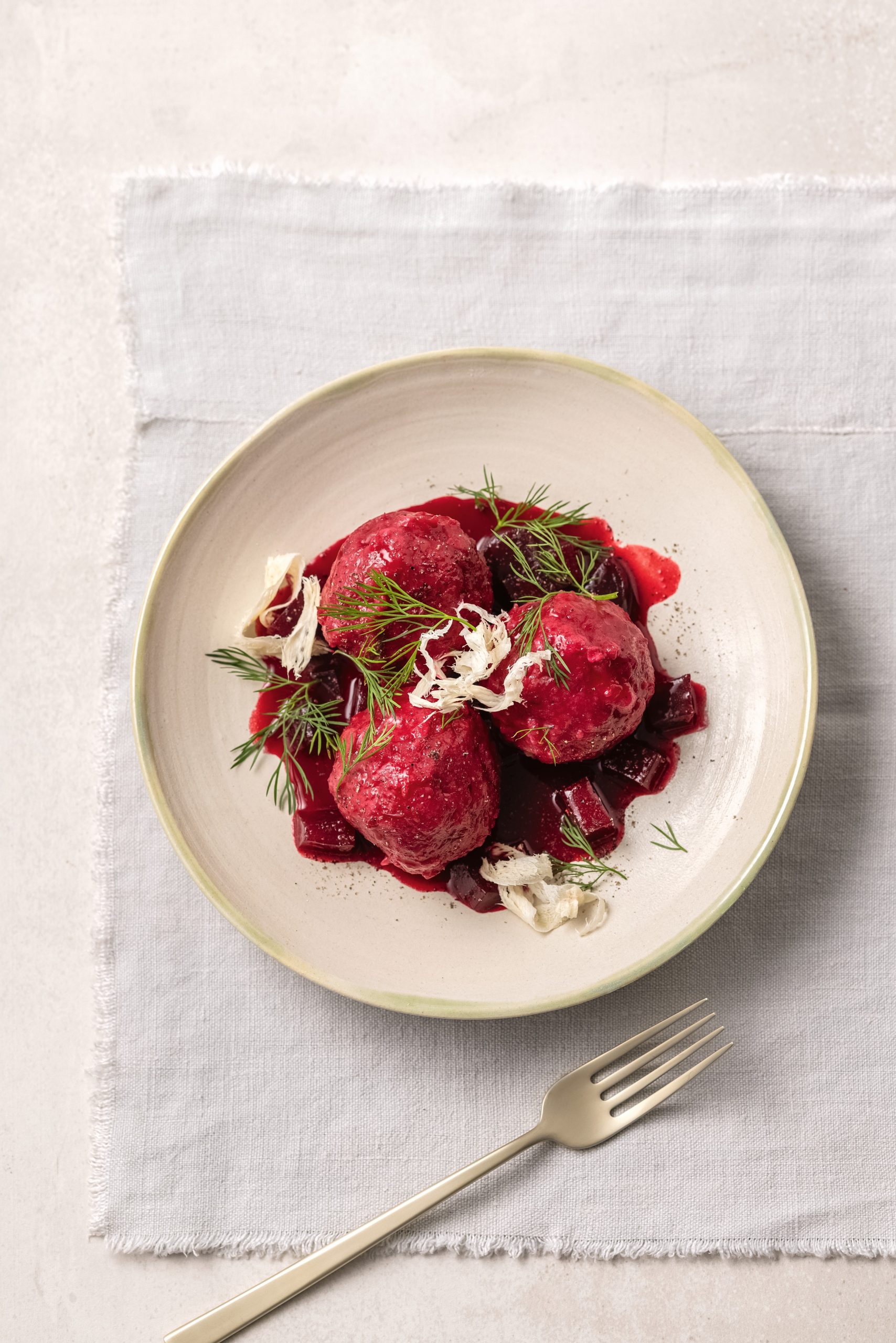 Vorstehendes Rezept „Rote-Bete-Knödel / Kümmelbutter / Meerrettich“ befindet sich auf Seite 223 des Buches „Ich lieb’s“ von Alexander Herrmann, das am 28.11.2025 im Verlag Dorling Kindersley erschien.