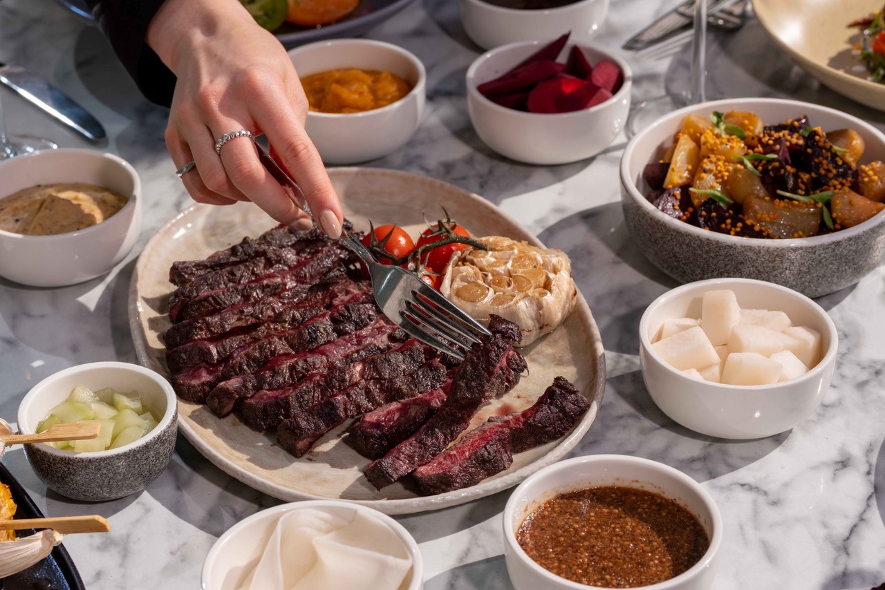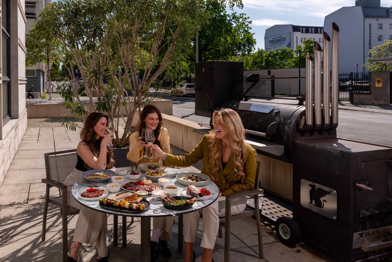 Denn eigentlich dreht sich beim „Saturday BBQ Social Menu“ auf der Terrasse des JW Steakhouse alles ums Fleisch, um ganz und gar Grandioses. Chefkoch Mirko Gonzales, gebürtiger Argentinier, ist wie könnte es anders sein, als Dirigent am Smoker ein wahrer Meister am Gerät. Es ist ein Blackworker BBQ Smoker Mustang der begehrliche Blicke auf sich und sein vielfältiges Wirken zieht. Und der dies einmalige Raucharoma verbreitet das – „high“ macht. Saftige Briskets, Steaks, Chicken Thighs, Seafood aber auch gut Vegetarisches werden gar schonend gegart. Im Grün des Dekors ornamentaler Pflanzen auf der überdachten Terrasse mit stylischen Hängelampen entfaltet sich die Premiere des „BBQ Social Menu“. Der Gast begibt sich auf „eine sensorische Reise durch Texturen, Temperaturen und Techniken“ kulinarischer Kunst. Geteilt werden „in echtem American Sharing Style“ Köstlichkeiten direkt aus der Küche, von der Barbecue-Station und vom Grill.