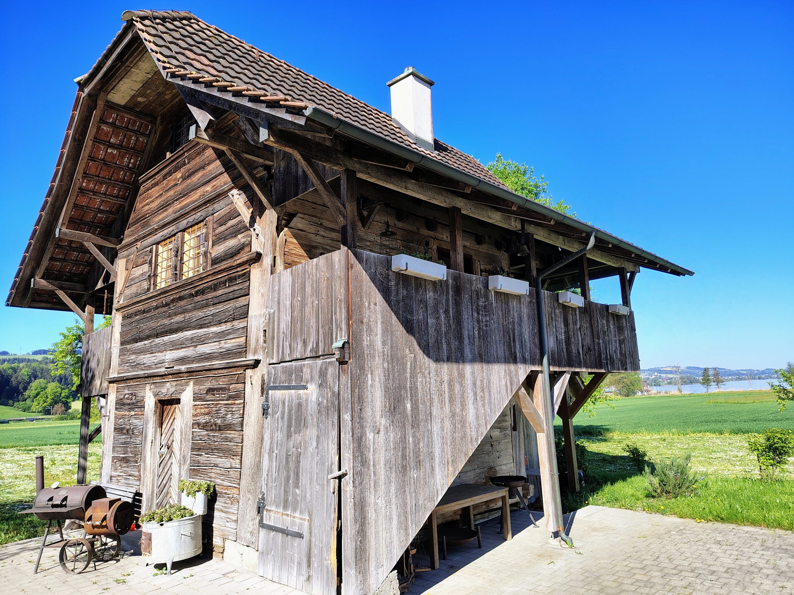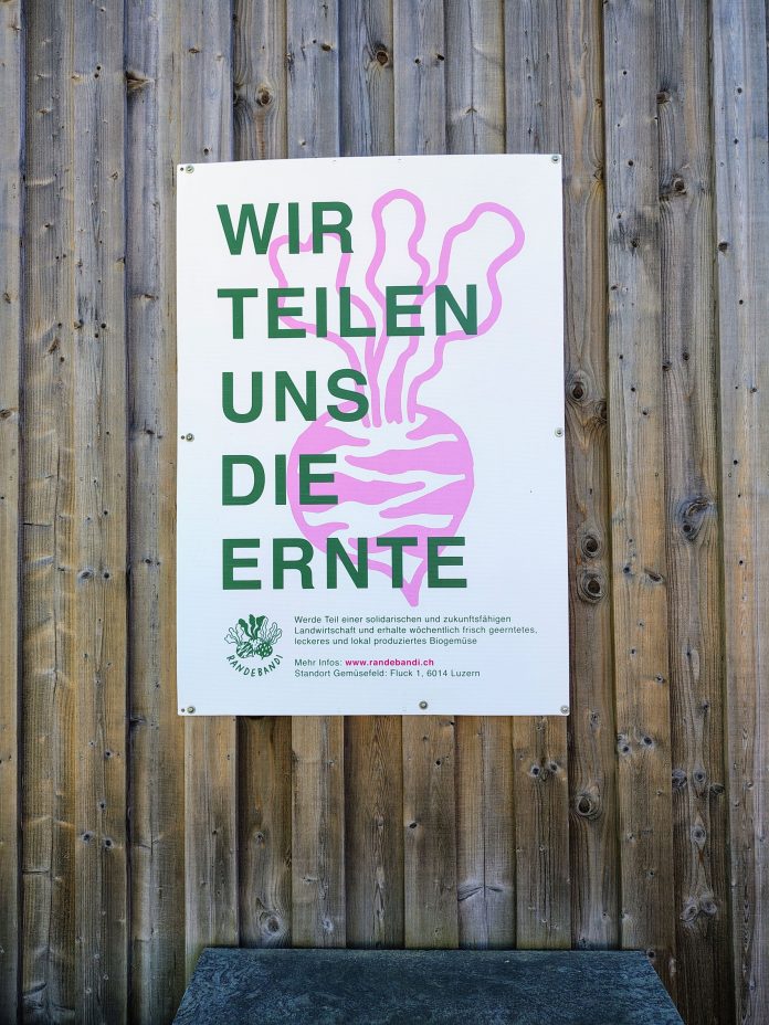 Sempach, Schweizerische Eidgenossenschaft (Gastrosofie). An einem Bauernhof am Bauernhof am Sempachersee sah ich ein Plakat mit der Aufschrift: „Wir teilen uns die Ernte.“